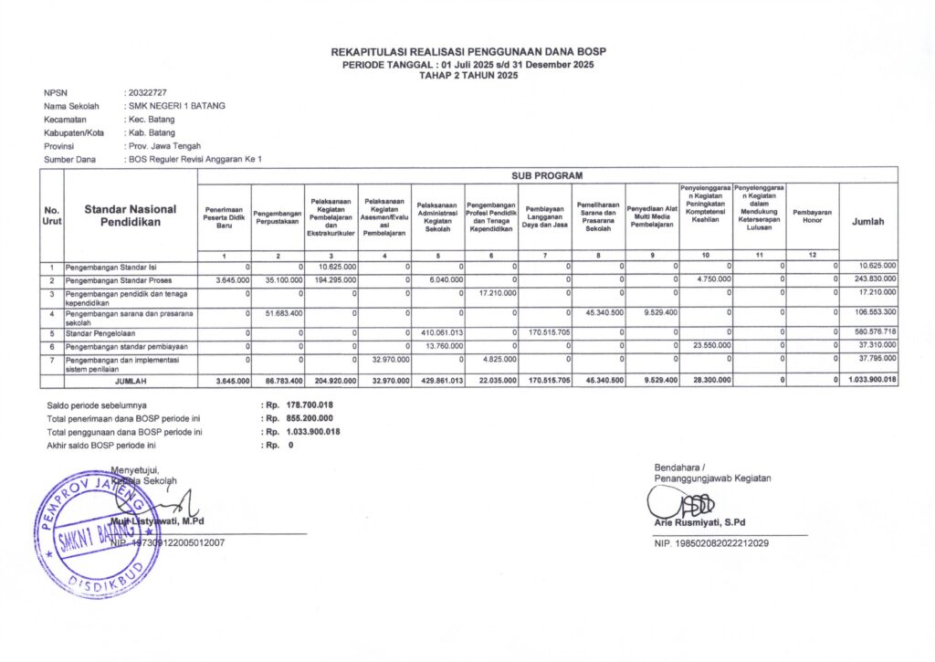 Laporan Realisasi Penggunaan Dana BOS Reguler Tahap 2 Tahun 2025 Sebagai bentuk transparansi dan akuntabilitas publik, SMK Negeri 1 Batang menyampaikan Laporan Realisasi Penggunaan Dana BOS Reguler Tahap 2 Tahun 2025. Dana Bantuan Operasional Sekolah (BOS) Reguler merupakan salah satu bentuk dukungan pemerintah untuk menunjang kegiatan operasional dan pembelajaran di sekolah